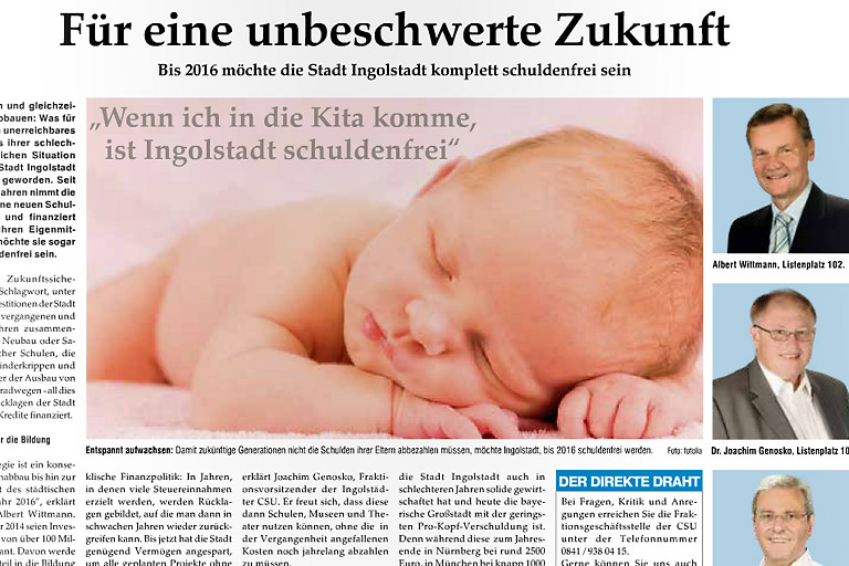 (ty) „Wenn ich in die Kita komme, ist Ingolstadt schuldenfrei.“ Mit diesem Spruch und dem Bild eines Babys hat die Stadt beim letzten Stadtratswahlkampf Werbung gemacht für die solide Haushaltspolitik in Ingolstadt. Das indes ist Schnee von gestern. Und es sah ja damals wirklich fast so aus, als ob Ingolstadt in der Tat 2016 schuldenfrei sein würde. Diese hehren Pläne indes hat Volkswagen zur Makulatur werden lassen. Statt Schuldenfreiheit sind jetzt neue Schulden angesagt für die Stadt, die wie keine andere bayerische Stadt am Tropf der Automobilindustrie hängt. Der nette Spruch jedenfalls dürfte derzeit eher lauten: „Wenn ich mein Abitur habe, ist die Stadt schuldenfrei.“