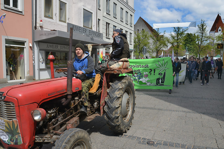 (ty) Einen bunten „Global Marijuana March“ veranstaltete heute am Vatertag der Cannabis Social Club in Ingolstadt. Mit einem roten Bulldog als Blickfang ging es mit den rund 60 Teilnehmern – unter ihnen die Linke-Bundestagsabgeordnete Eva Bulling-Schröter – quer durch die ganze Fußgängerzone und auf den Rathausplatz. Ziel der bunten Demo war die Werbung für eine Legalisierung von Cannabis.