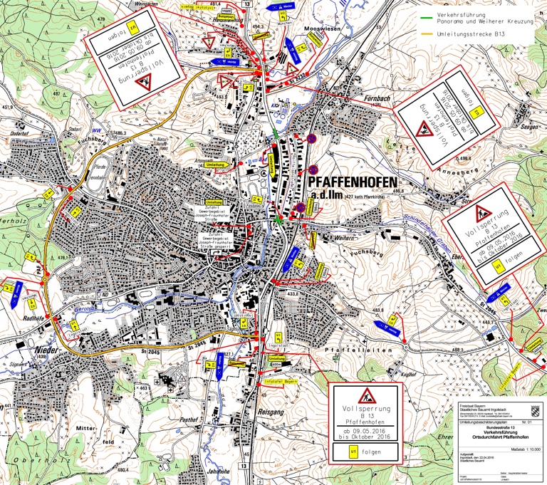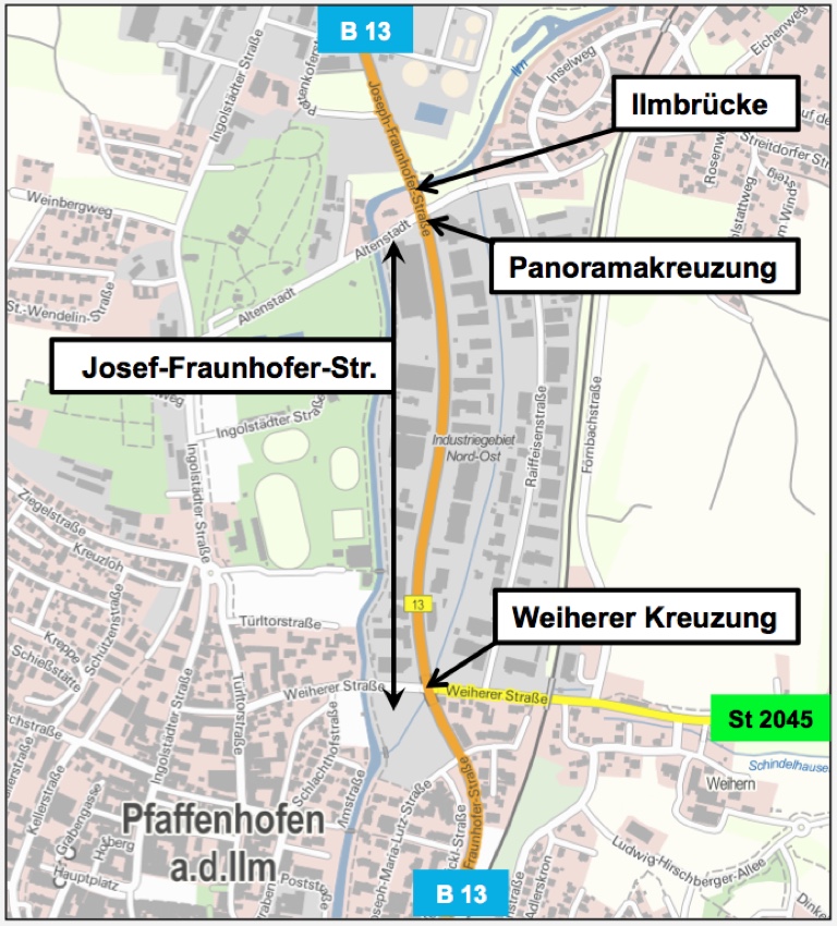 Ziel des Staatlichen Bauamts Ingolstadt und der Stadt Pfaffenhofen ist es, die Einschränkungen und Behinderungen für die an der B 13 ansässigen Geschäftsleute durch die Vollsperrung möglichst gering zu halten. Daher sei es vorgesehen, die Vollsperrung für die Asphaltierung der rund einen Kilometer langen Strecke zwischen Panorama- und Weiherer Kreuzung voraussichtlich über das Feiertagswochenende „Tag der Deutschen Einheit“ durchzuführen: von Samstag, 1. Oktober (ab etwa 18 Uhr), bis Montagabend, 3. Oktober.