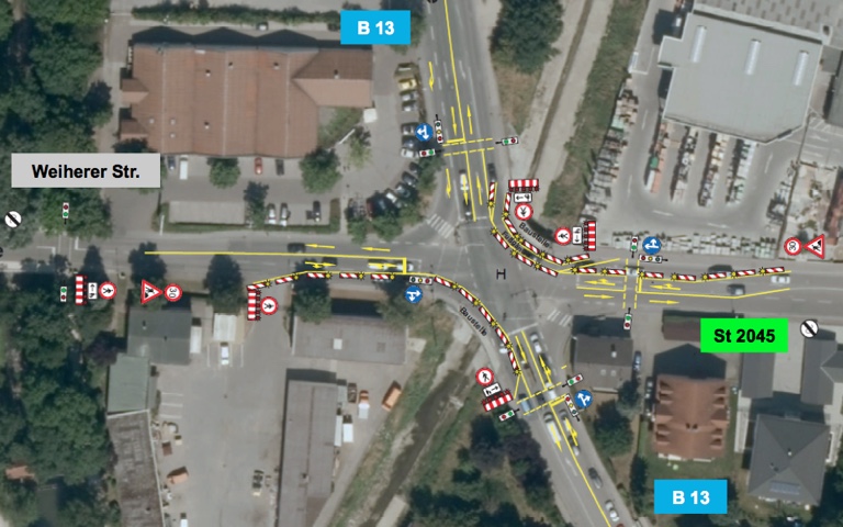 Während der Bauarbeiten ist an allen vier Ästen der Weiherer Kreuzung (Joseph-Fraunhofer-Straße und Weiherer Straße) kein Linksabbiegen möglich. Denn, so Schönbrodt: „Ein Linksabbiegen würde zu massiven Rückstauungen auf allen vier Straßenästen führen.“ Die Umleitungen werden örtlich beschildert. Im Zuge der Arbeiten wird zwischenzeitlich auch für etwa eine Woche von der B13 aus kein Rechtsabbiegen in Richtung Weiherer Straße (Stadtmitte) sowie kein Rechtsabbiegen in die Staatsstraße (stadtauswärts) möglich sein.
