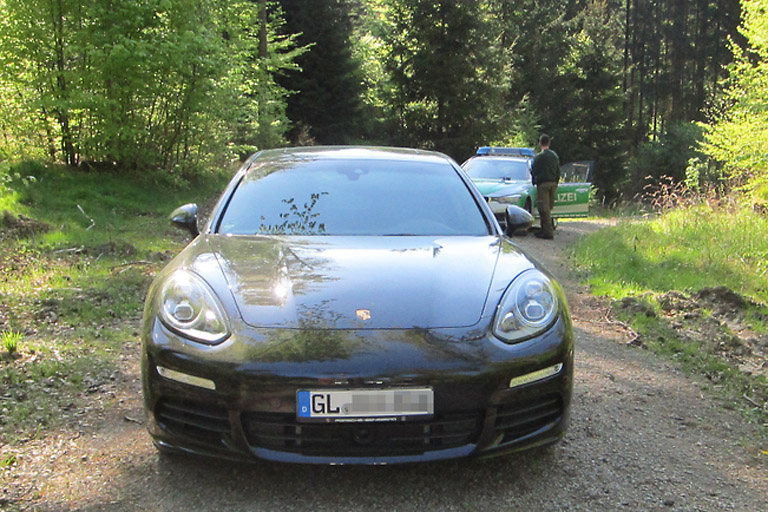Gegen 16.15 Uhr entdeckte ein Förster gestern in einem Waldstück bei Bad Kissingen einen schwarzen Porsche Panamera mit Bergisch Gladbacher Zulassung auf einem Feldweg. Auf dem Beifahrersitz saß zu diesem Zeitpunkt ein Mann, der dem Förster sofort verdächtig vorkam. Er fackelte nicht lange und wählte den Notruf. Als die erste Streifenbesatzung vor Ort ankam, war das Fahrzeug bereits verlassen. Eine Überprüfung ergab, dass der Porsche am Samstag aus einem Autohaus in Nordrhein-Westfalen entwendet worden war. Eine groß angelegte Fahndung nach dem flüchtigen Fahrzeuginsassen, an der neben mehreren Streifenbesatzungen auch ein Polizeihubschrauber beteiligt war, verlief ergebnislos.