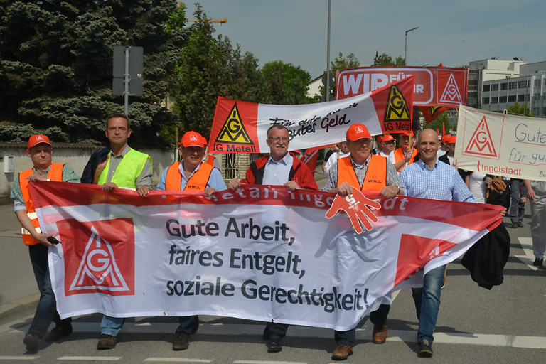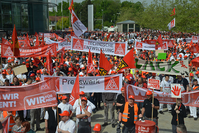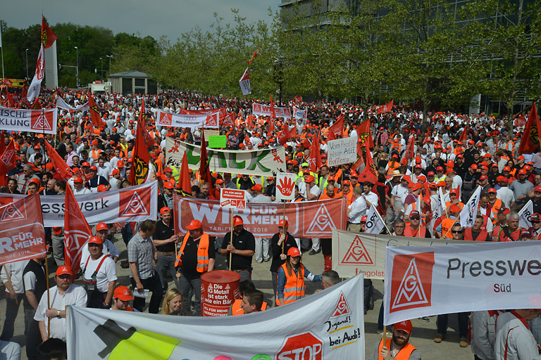 Über 15 000 IG-Metaller aus der ganzen Region haben sich heute auf der Audi Piazza in Ingolstadt versammelt, um für fünf Prozent mehr Lohn zu streiken