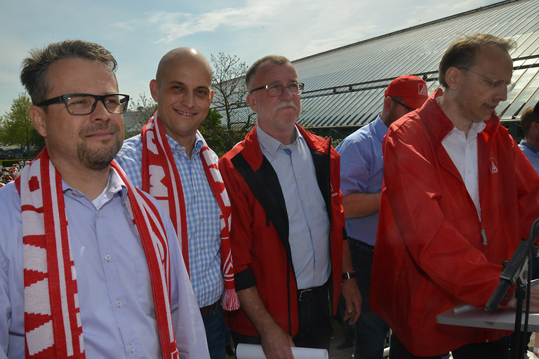 „Die Arbeitgeben reagieren nur auf Warnstreiks und Druck. Und das ist heute ein deutliches Zeichen“, rief Bernhard Stiedl den IG-Metallern zu, „54 Milliarden haben die Unternehmen der Metall- und Elektroindustrie an Gewinnen im letzten Jahr eingefahren. Da sind schon alle Löhne gezahlt, alle Kosten ausgeglichen, alle Investitionen abgeschrieben. Und knapp acht Milliarden Euro kostet unsere komplette Lohnerhöhung. Und wir sagen, das Geld ist besser in Löhne investiert, die die Nachfrage erhöhen, als in Spekulationen an den Aktienmärkten oder in Briefkastenfirmen in Panama.“