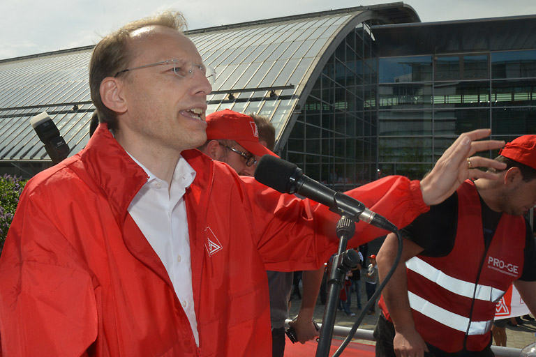 Er rechnete vor, dass die Dividendenausschüttung für die Aktionäre der vier größten Mitglieder des Arbeitgeberverbandes Gesamtmetall – BMW, Daimler, Airbus und Siemens – knapp zehn Milliarden Euro betragen hätte. Die Forderung der IG Metall für fünf Prozent mehr Lohn würde sich hingegen auf acht Milliarden Euro belaufen. „Das wäre doch auch mal fair.“
