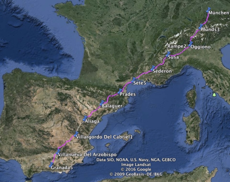 Nach dem Start in der bayerischen Landeshauptstadt will das Team laut FMG in elf Tagesetappen mit Distanzen von bis zu 237 Kilometern Granada erreichen (siehe Karte). Rund 20 000 Höhenmeter müssen dabei bewältigt werden – unter anderem führt die Route über die Zentral- und die Westalpen sowie über die Pyrenäen. Um diese Herausforderung zu meistern, steht seit Februar regelmäßiges hartes Training auf dem Programm.