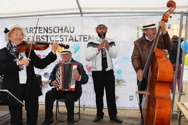 Für musikalische Unterhaltung sorgte die Gruppe „Klezmeron“ aus Nürnberg – sie hätte mehr Zuhörer verdient gehabt. Gartenschau-Geschäftsführerin Eva Linder ließ sich von dem schlechten Wetter aber nicht die gute Laune verderben und wertete den Regen bei dieser „Ein Jahr davor“-Veranstaltung als gutes Omen für die tatsächliche Eröffnung der Gartenschau in genau einem Jahr: „Pech bei der Generalprobe bringt doch Glück für die Premiere“, hofft sie.