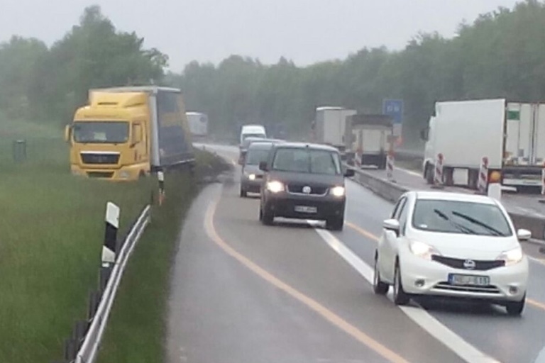 (ty) Gestern gegen 13.10 Uhr kam ein ungarischer Sattelzug im Baustellenbereich nach der A3-Anschlussstelle Neumarkt-Ost in Richtung Nürnberg aus nicht geklärter Ursache nach rechts von der Fahrbahn ab. Der Lkw stand schließlich komplett im Grünstreifen (Foto oben) und musste durch ein Abschleppunternehmen geborgen werden. Da für die Maßnahme beide Spuren benötigt wurden, war eine Ausleitung des kompletten Verkehrs an der Ausfahrt Neumarkt-Ost ab 15.45 Uhr erforderlich. Darum kümmerte sich die Autobahnmeisterei. Bei dem Unfall wurde niemand verletzt. Die Bergung des Lkws war gegen 19 Uhr abgeschlossen; der Rückstau betrug bis zu sechs Kilometer.