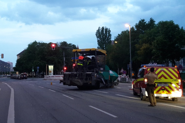 (ty) Heute Nacht gegen 3.25 Uhr bemerkten Zeugen in München eine selbstfahrende Baumaschine, die auf der Auerfeldstraße in der Au stand. Die Maschine war nicht beleuchtet und sie blockierte einen Fahrstreifen (Foto oben). Die Zeugen sahen noch drei junge Personen, die sich von der Maschine entfernten. Sie müssen die 28 Tonnen schwere Baumaschine auf einer nahen Baustelle gestartet und auf die Straße gefahren haben. Sie konnten davor auf der Baustelle die Schlüssel entwenden.