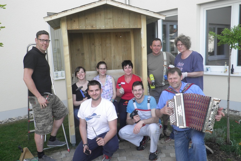 Die Bewohner des Caritas-Alten- und Pflegeheims St. Emmeran in Geisenfeld können sich jetzt über einen Strandkorb beziehungsweise über eine Strandhütte freuen. Hierfür haben fünf motivierte Autobauer bei bester Stimmung gesägt, geschraubt und gepinselt, um das gute Stück nach den Vorstellung der Heimleitung zu bauen. Im Anschluss wurde mit den Bewohnern der erfolgreiche Abschluss des Projekts gefeiert.