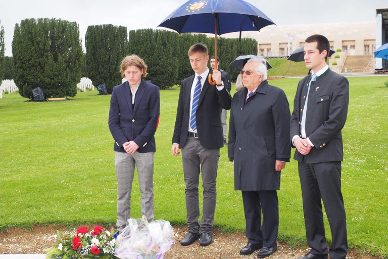 Nach der Besichtigung der Festungsanlage (Fort Douaumont) versammelte sich die Paneuropa-Jugend im Beisein von Terrenoire zu einer Gedenkstunde auf dem Soldatenfriedhof. Christian Hoferer aus Wolnzach-Burgstall wandte sich in seiner Funktion als PEJ-Landesvorsitzender auf Französisch an die Teilnehmer und erinnerte mit der Schuman-Rede, der Montanunion und der Versöhnungsgeste von François Mitterrand und Helmut Kohl an wichtige Stationen der deutsch-französischen Aussöhnung. Gerade in einer Zeit, in der EU-Skepsis und Extremismus in Europa erstarkten, sei das deutsch-französische Zweigespann ein wichtiger Garant für den europäischen Frieden und die europäische Zusammenarbeit.