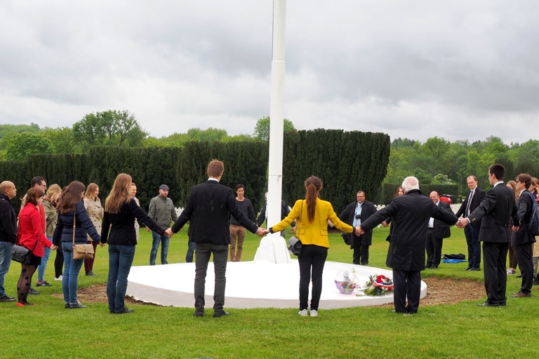 Nach den Ansprachen legte die Gruppe gemeinsam ein Blumengesteck zum Totengedenken nieder. Den Abschluss der Zeremonie bildete eine Friedenskette aller internationalen Teilnehmer.