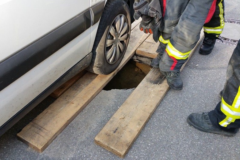 Das Loch war – wie die Fotos zeigen – etwa einen halben Quadratmeter groß. Wie die Polizei berichtet, war der Hohlraum durch eine Unterspülung verursacht worden. Der Bereich wurde von Kräften der Feuerwehr und Mitarbeitern des Bauhofs abgesichert. An dem Kleinlaster entstand nach bisherigen Informationen kein Schaden; die Floriansjünger kümmerten sich um die Bergung.