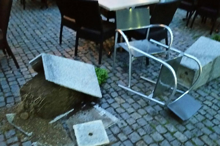 Mehrere Polizeistreifen wurden zum Ort des Geschehens beordert. Bis zu deren Eintreffen hatten sich die Randalierer jedoch bereits entfernt. Vier Männer aus der Gruppe wurden aber kurz darauf in unmittelbarer Nähe des Cafés von der Polizei gestellt. Alkoholmessungen ergaben Werte zwischen 1,14 und 1,76 Promille.