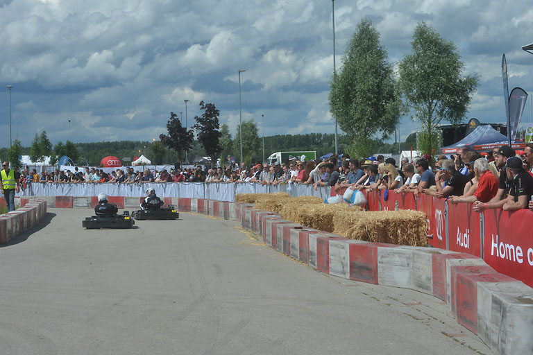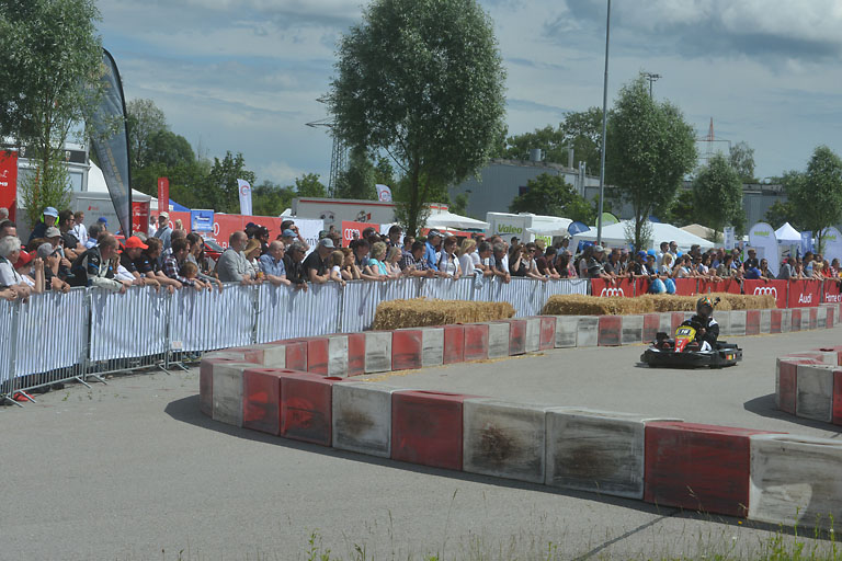 (ty) Auf die Sekunde zeitgleich mit Le Mans startete heute um 15 Uhr der „Große Preis von Ingolstadt – 24 Stunden“ auf dem Gelände vor dem Audi Sportpark. Und das vor großer Kulisse. Denn Zuschauer sind bei dem nahezu idealen Wetter genügend gekommen, um sich die flotten Renner anzusehen, die über den 1,2 Kilometer langen Kurs brettern, als wären sie bei der Formel 1. Die Fahrer, das sah man gleich bei den ersten Runden, sind durchaus ambitioniert bei der Sache. Und jedes Team will selbstredend den Sieg einfahren.
