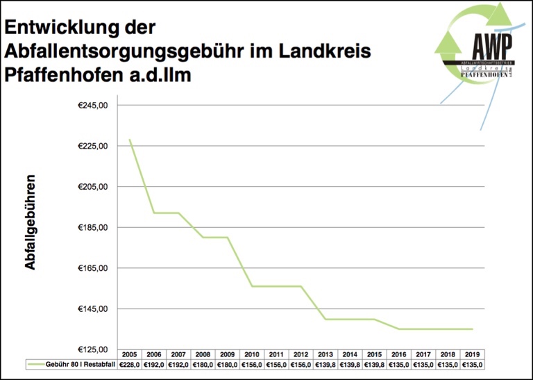 Mit der im Dezember vom Kreistag beschlossenen Senkung setzt sich der Trend der fallenden Müllgebühren im Landkreis Pfaffenhofen erfreulich fort. Im Jahr 2005 musste man für eine 80-Liter-Tonne noch 228 Euro per anno hinlegen, jetzt sind es gerade mal 135 Euro. Landrat Martin Wolf (CSU) sprach von einem guten Signal an die Bürger und sieht das Abfall-System des Landkreises bestätigt. Zugleich bat er die Bürger auch weiterhin um konsequente Müllvermeidung und Mülltrennung.