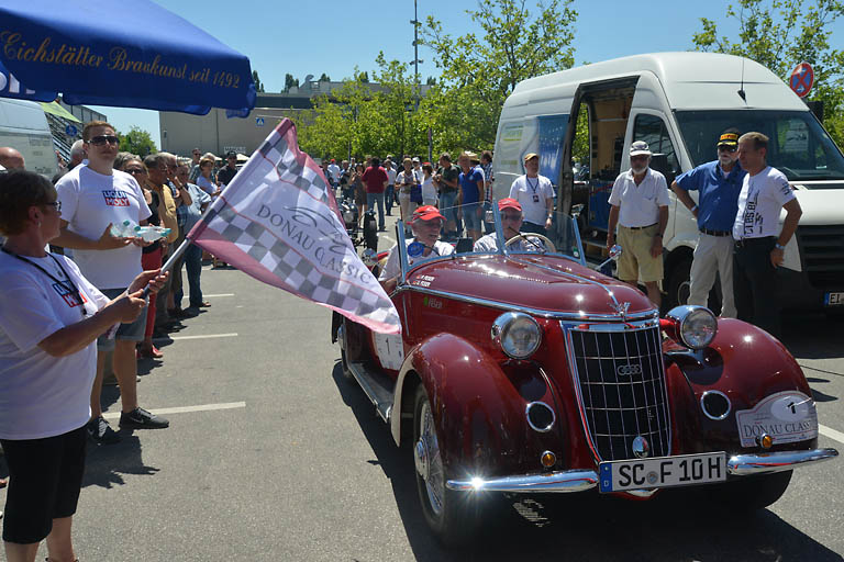 (ty) Pünktlich um 13.30 Uhr ging heute am Ingolstädter Westpark der Start zur elften Auflage der Donau Classic über die Bühne. Zuschauer waren bei den üppigen Temperaturen jedoch eher Mangelware. Erstes Ziel ist heute Rennertshofen, bevor es über Rain und Pöttmes zurück nach Neuburg geht. Bis übermorgen sind rund 480 Teilnehmer mit ihren Old- und Youngtimern im Herzen Bayerns unterwegs. Ü̈ber vierzig Marken sind vertreten. Von raren Vorkriegscabrios und Rennwagen aus dem Hause Wanderer, Bentley, DKW, Alvis und Riley über rassige Exoten der Marken Lamborghini, Ferrari und Jaguar bis hin zu Modellen wie den Audi Sport quattro.
