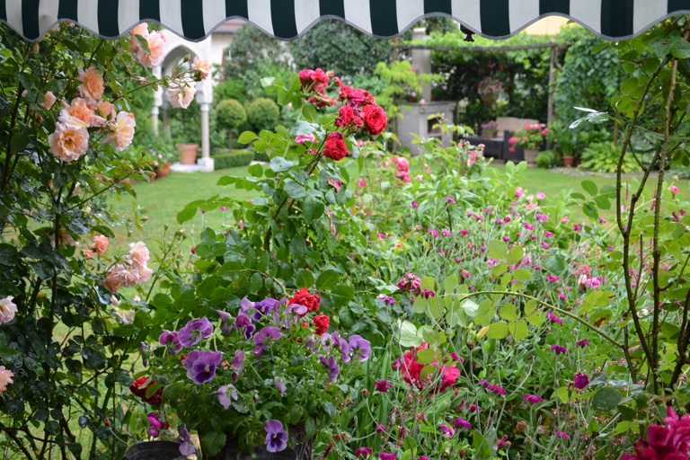 Mit viel Liebe angelegter ländlicher Hausgarten, mit weinumrankter Pergola, vielen verstecken Sitzplätzen und großen Kübelpflanzen. Der Garten liegt an der Ortsdurchfahrt in Letten.