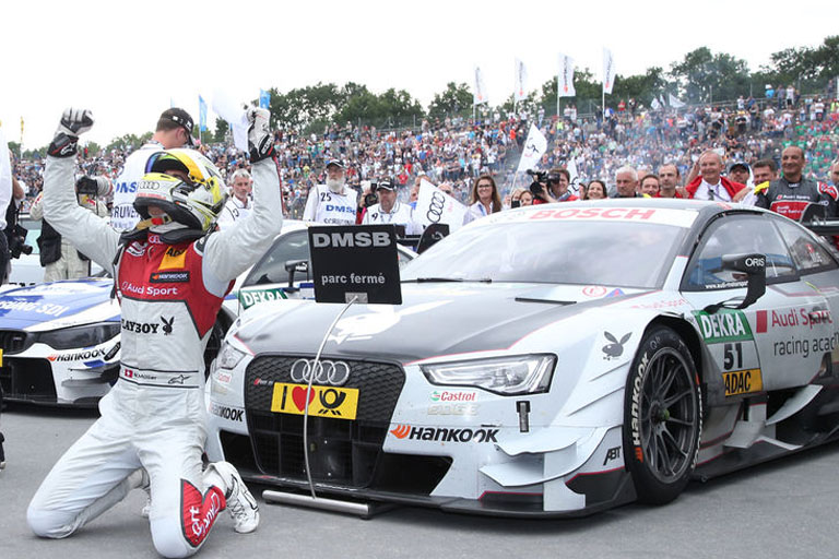 Nach „Forza Italia“ mit dem Sieg von Edoardo Mortara am Samstag „Hopp, Schwiiz!“ am Sonntag: In seinem 36. DTM-Rennen feierte der jüngste Audi-Werksfahrer seinen ersten Sieg in der DTM. Vor einer eindrucksvollen Kulisse von 123 500 Zuschauern zeigte der Schweizer am Steuer seines Playboy Audi RS 5 DTM eine makellose Leistung. Vom dritten Startplatz ins Rennen gegangen, verbesserte er sich schon in der ersten Kurve auf Position zwei. Anschließend machte Müller Druck auf den von Platz eins gestarteten Tom Blomqvist und überholte den BMW auch dank eines schnelleren Boxenstopps. In der Schlussphase kontrollierte Müller das Tempo und ließ sich selbst durch eine Safety-Car-Phase kurz vor dem Ziel, die seinen Vorsprung von 2,5 Sekunden zunichte machte, nicht aus der Ruhe bringen.