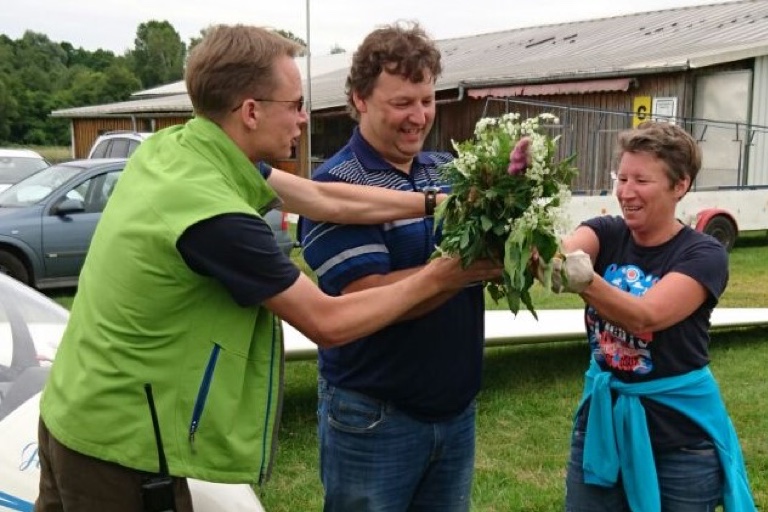 Nach der Landung war ihm die Freude deutlich anzusehen – er hatte auch lange für diesen Moment gearbeitet. Die anderen Piloten und Flugschüler eilten zu ihm, um zu gratulieren und alles Gute zu wünschen. Dann wurde, gemäß der Tradition unter Segelfliegern, der "Hinterteil für die Thermik sensibilisiert" und ein Brennnessel-Strauß überreicht, der das Gefühl für den Steuer-Knüppel im Flugzeug stärken soll.