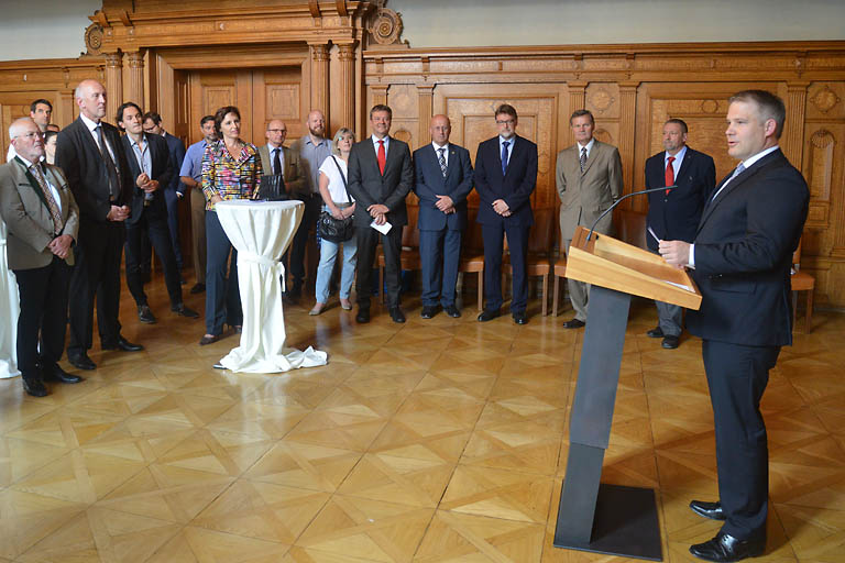 Oberbürgermeister Christian Lösel hatte nach dem Zuschlag für ein Digitales Gründerzentrum zur kollektiven Freude in den Historischen Sitzungssaal des Ingolstädter Rathauses geladen