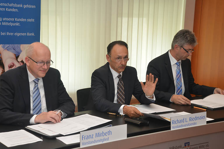 (ty) Die Stimmung ist „äußerst positiv“ bei der die Volksbank Raiffeisenbank Bayern Mitte eG. In einer Pressekonferenz zeigte sich der Vorstandsvorsitzender Richard L. Riedmaier dabei nicht nur mit dem Ergebnis des vergangenen Jahres zufrieden, sondern auch mit den Ergebnissen des laufenden Jahres. Und auch mit dem, was die Vertreterversammlung der Bank mit Blick auf die Zukunft beschlossen hat. Und dazu gehört neben einer intensiven Investition unter anderem in den regionalen Immobilienmarkt und auch in regenerative Energien den Focus zu richten auf eine konsequente Digitalisierung, die intern und extern Vorteile bringen soll und auf die Verschmelzung des Immobilien- und Versicherungsgeschäftes mit der Bank.