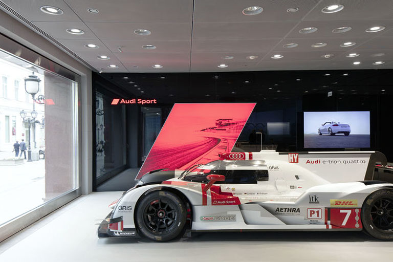 Auf den zwei Etagen der Audi City Moskau finden sich dafür drei raumhohe Powerwalls. Hier können sich Kunden aus mehreren hundert Millionen Auswahlmöglichkeiten ihr individuelles Traumauto konfigurieren. Die Powerwalls ermöglichen dabei eine nahezu realitätsgetreue 1:1 Darstellung des Wunsch-Audi. Selbst kleinste Ausstattungsdetails werden hochauflösend und präzise gezeigt. Für individuelle Beratungsgespräche stehen zwei Customer Private Lounges mit separaten Multitouch-Tables und Multimedia-Wand zur Verfügung.