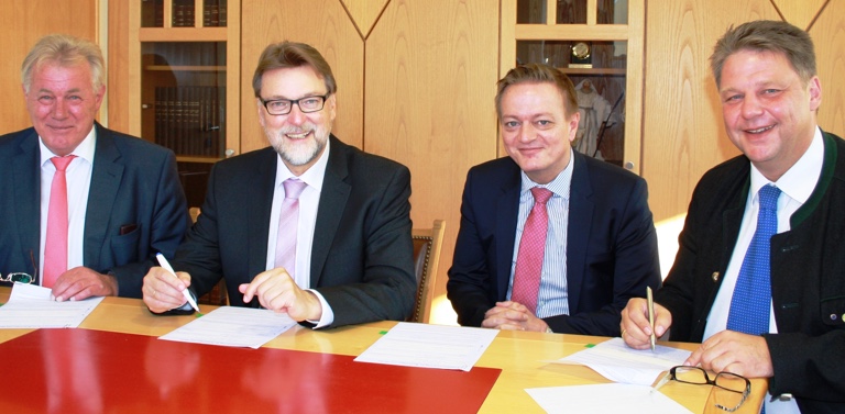 Vertragsunterzeichnung: Vohburgs Bürgermeister Martin Schmid (von links), Landrat Martin Wolf, der Landtagsabgeordnete Karl Straub und Wolnzachs Rathauschef Jens Machold.