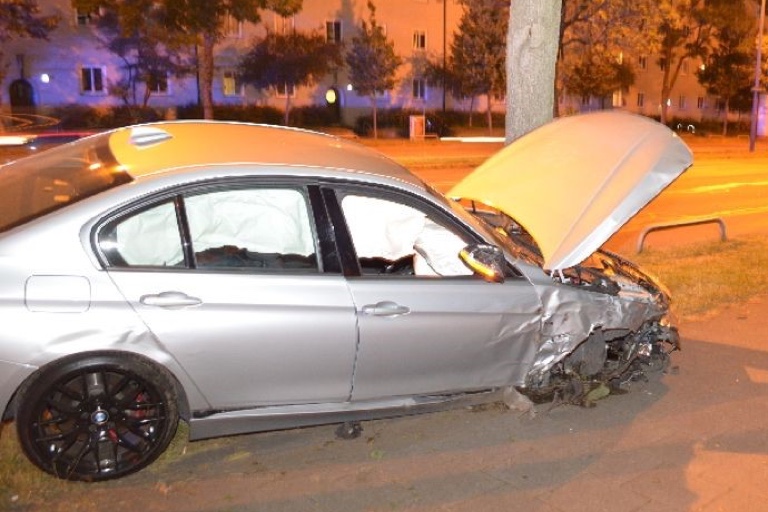 Anschließend touchierte der Mechaniker mit seiner Front noch einen ordnungsgemäß am rechten Straßenrand geparkten Golf. Dadurch verlor der 24-Jährige endgültig die Kontrolle über seinen Pkw und kam nach rechts von der Straße ab. Dort prallte er mit der Front seines BMW gegen einen Baum auf dem Grünstreifen. Des Weiteren kam er mit seinem linken Hinterreifen auf einem Parkverhinderungsbügel zum Stehen (Foto oben).