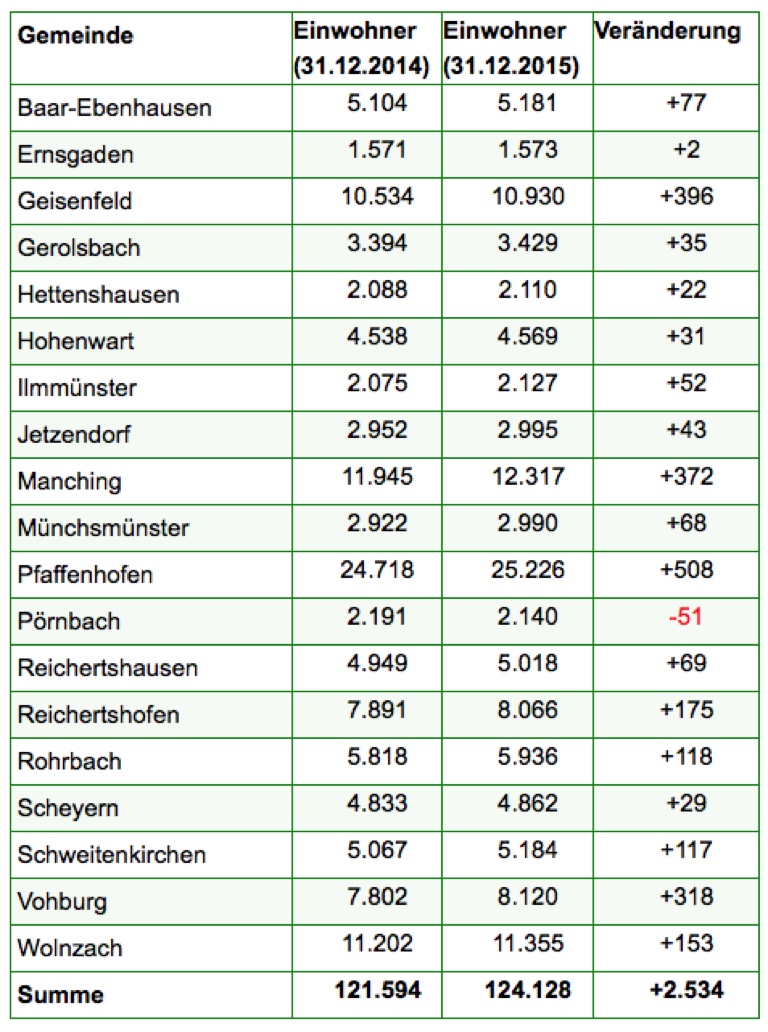 Gegenüber dem Bevölkerungsstand vom 31. Dezember 2014 (121 594 Einwohner) bedeutet dies einen Anstieg um 2534 Personen oder rund 2,08 Prozent innerhalb des vergangenen Jahres. Nach absoluten Einwohnerzahlen gab es in der Stadt Pfaffenhofen im vergangenen Jahr den stärksten Zuwachs mit einem Plus von 508 Einwohnern, gefolgt von der Stadt Geisenfeld (396) und dem Markt Manching (372).