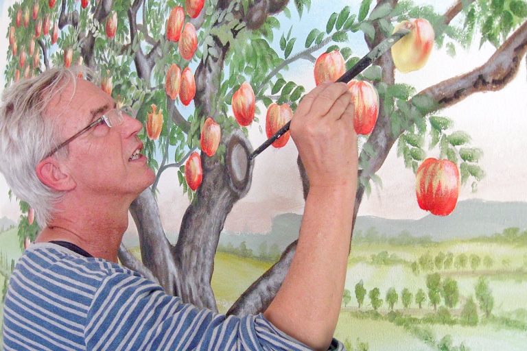 (ty) Wer kürzlich die Tierherberge besucht hat, konnte im Eingangsbereich das neue, wandfüllende Gemälde des Künstlers Pit Zaepernick nicht übersehen. Es ist mit 2,80 Metern Höhe größer als der Maler selbst sowie vier Meter breit und zeigt einen Apfelbaum, der über und über behangen ist mit saftigen, rot-gelben Früchten. „Baum der Zuwendung“ wurde er benannt.