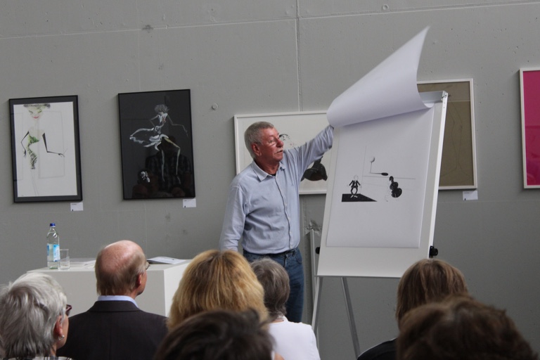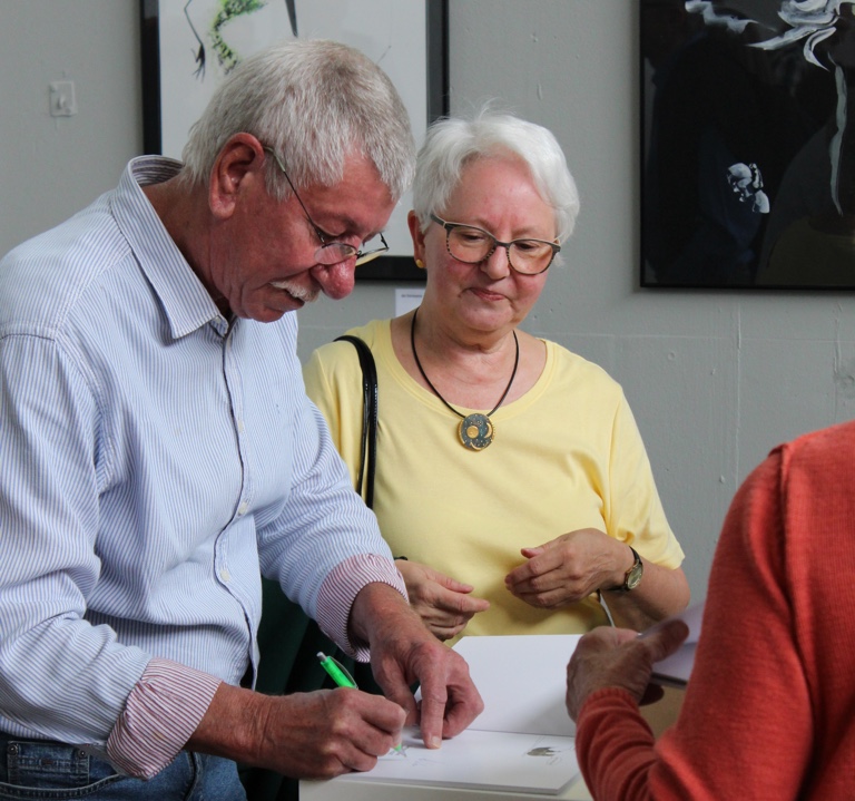 Im Anschluss an die Präsentation und den augenzwinkernden Hinweis, dass Weihnachten ja vor der Tür stehe, signierte Klee noch Bücher, führte die Gäste durch seine Ausstellung und gab dabei einen interessanten und anekdotenreichen Einblick in die technischen, motivischen und gedanklichen Hintergründe der einzelnen Werke.