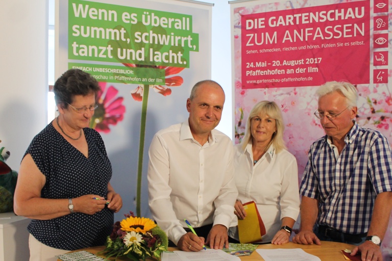 Bei der Unterzeichnung des Kooperations-Vertrags: Gottfried Klösel und Monika Weisenfeld-Klösel von der Firma „Weisenfeld Sonnensegel & Dachbegrünung“, flankiert von den beiden Gartenschau-Geschäftsführern Eva Linder (links) und Walter Karl (rechts).
