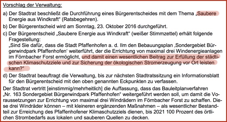 Der Vorschlag in der Sitzungsvorlage lautete: „Sind Sie dafür, dass die Stadt Pfaffenhofen den Bebauungsplan ‚Sondergebiet Bürgerwindpark Pfaffenhofen‘ weiterführt, der die Errichtung von maximal drei Windenergie-Anlagen im Förnbacher Forst ermöglicht, und damit einen wesentlichen Beitrag zur Erfüllung der städtischen Klimaschutzziele und zur Sicherung der ökologischen Stromerzeugung vor Ort leisten kann?“
