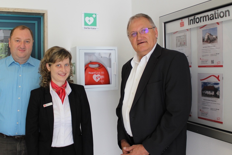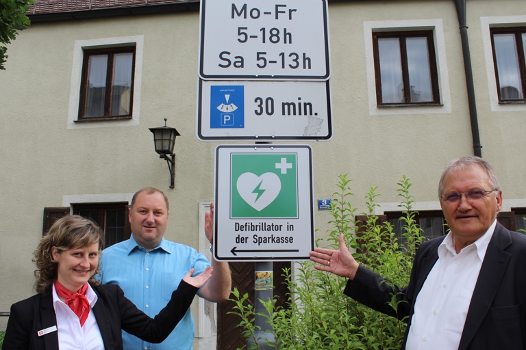 In der Geschäftsstelle der Sparkasse Aichach-Schrobenhausen wurde jetzt ein Defibrillator installiert – Mehrere Schilder weisen den Weg zu dem wichtigen Gerät