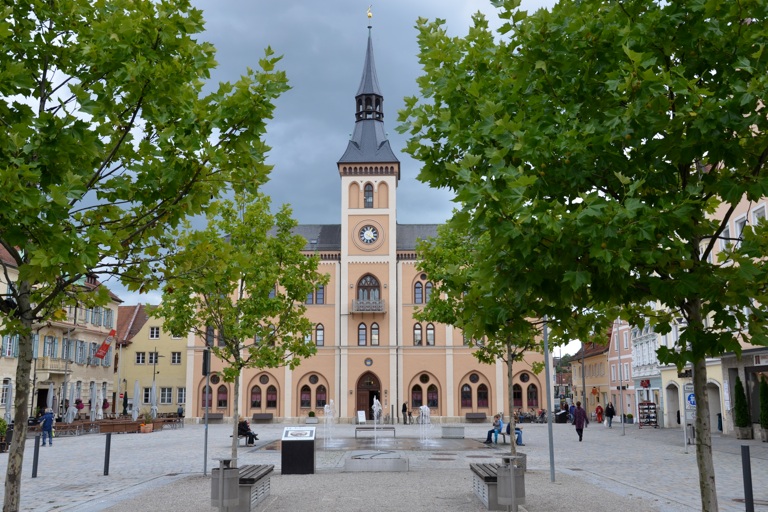Wer in Pfaffenhofen ist, kann das Wasserspiel auf dem Hauptplatz kaum übersehen. Die Idee wurde für den Ingolstädter Paradeplatz übernommen – nur zwei Nummern kleiner.