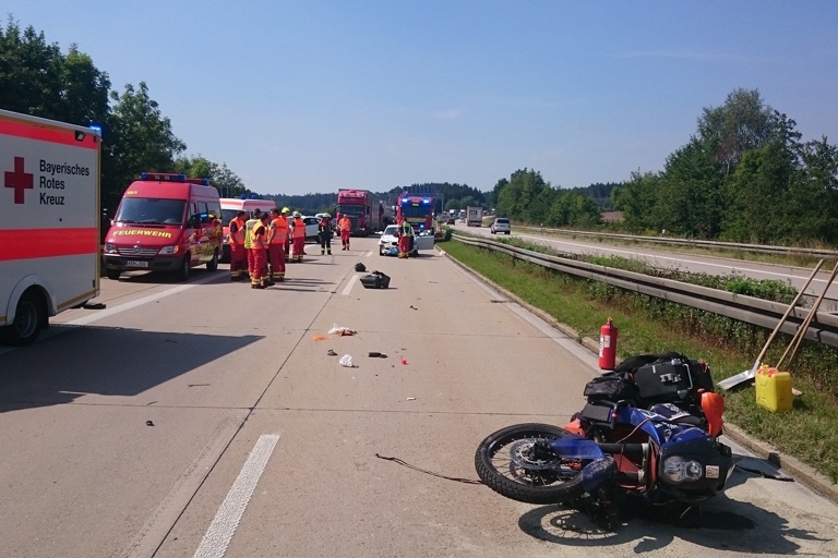 Nach derzeitigem Kenntnisstand der Polizeiinspektion Mainburg hatte der Motorrad-Fahrer auf die linke Spur gewechselt und dabei einen herannahenden Pkw übersehen. Es kam daraufhin zum Auffahrunfall und das Motorrad kam zum Sturz, schlitterte danach noch mehrere Meter über die Fahrbahn. Die beiden Verunglückten erlitten nach bisher vorliegenden Informationen mittelschwere Verletzungen; sie wurden vom Rettungsdienst in ein Krankenhaus gebracht.