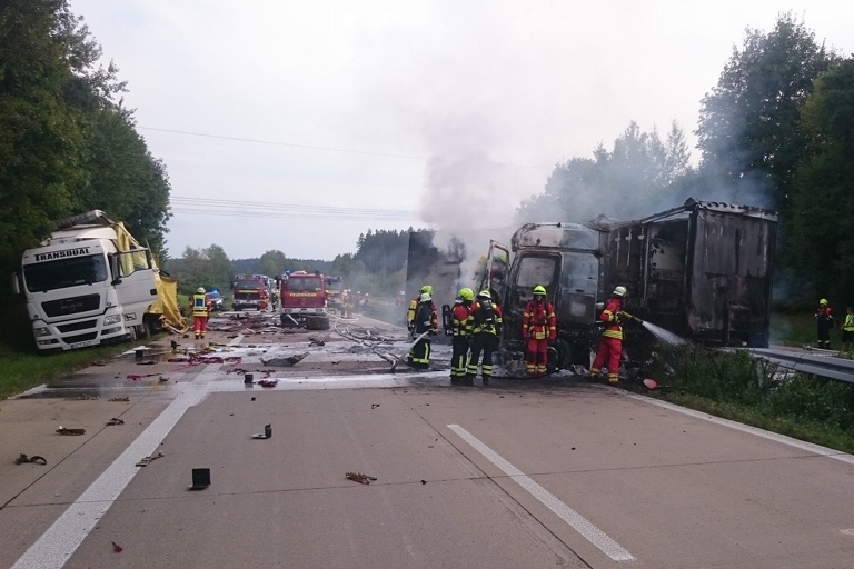 Der oberfränkische Auflieger, der mit Dachziegeln beladen war, wurde durch den Aufprall stark beschädigt, berichtet die Polizei. Der Sattelzug des Ungarn prallte nach der Kollision von dem oberfränkischen Auflieger ab und durchbrach daraufhin die Mittelleitplanke. „Nachdem er auf der Gegenfahrbahn der Autobahn zum Stehen kam, brannte er vollständig aus“, fasst ein Polizei-Sprecher zusammen. Beide Lkw-Lenker konnten ihre Fahrzeuge zum Glück unverletzt verlassen.