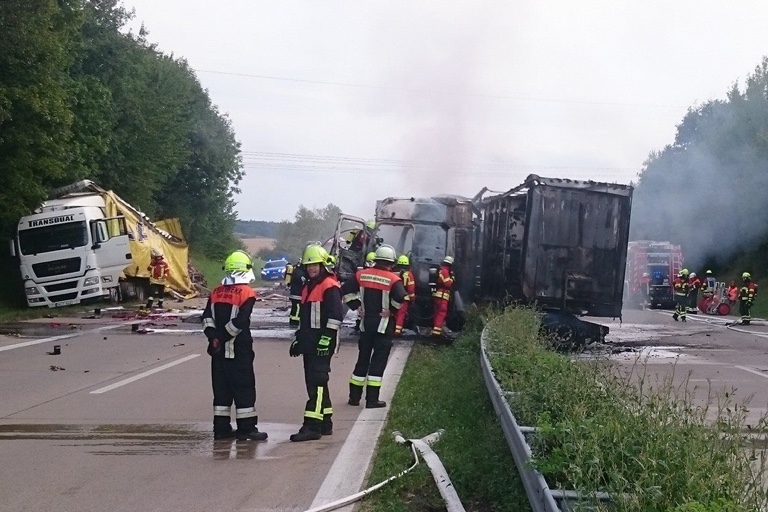 Die Autobahn musste in diesem Bereich für die Dauer der Löscharbeiten komplett gesperrt werden. Auch zur Bergung der beiden demolierten Sattelzüge war zeitweise für die jeweilige Fahrtrichtung die A 93 gesperrt. Der entstandene Sachschaden wird auf satte 300 000 Euro beziffert.
