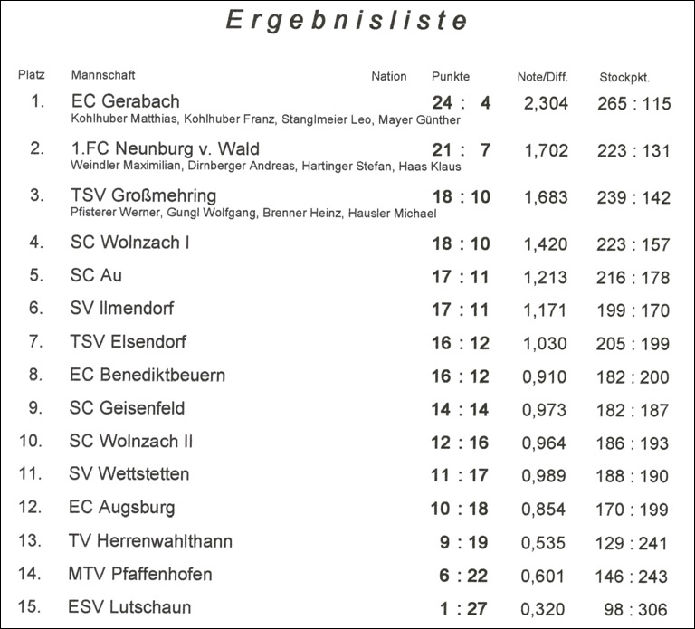 Das Team mit der weitesten Anreise, die Sportskameraden aus Lutschaun in Österreich, hatte sportlich einen furchtbar schwarzen Tag erwischt und musste sich mit 1:27 Punkten auf dem allerletzten Platz wiederfinden. Allerdings konnte der Frust über das erfolglose Abschneiden durch einen Besuch auf dem Wolnzacher Volksfest sicher etwas abgemildert werden.