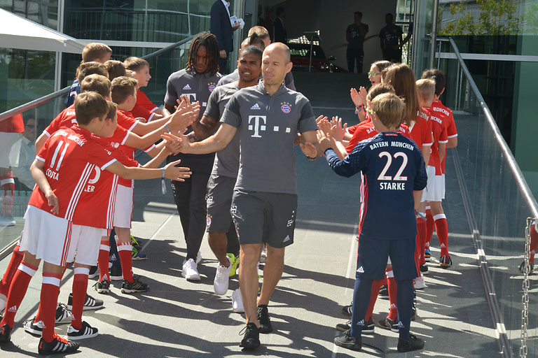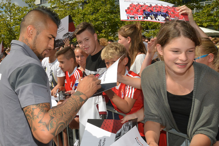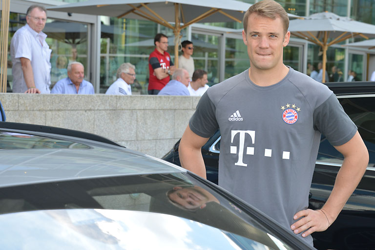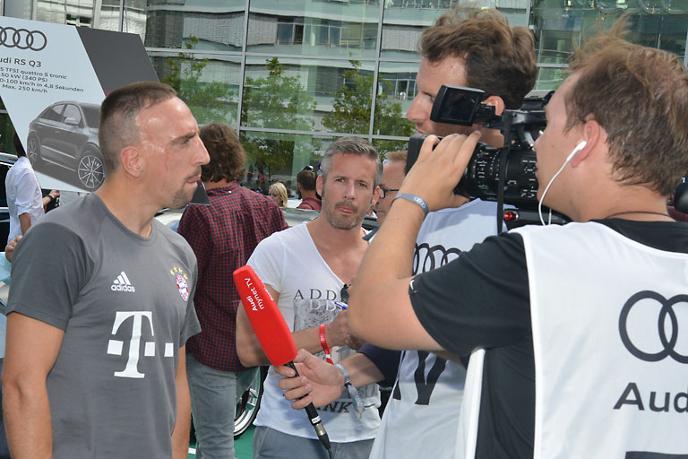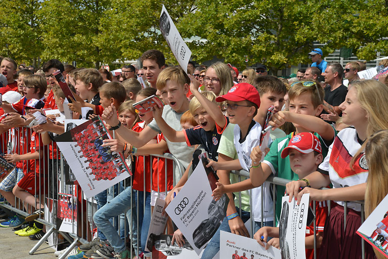 Der Medienrummel war gigantisch, als Müller, Neuer und Co. auf der Piazza einliefen und nach dem obligatorischen Gruppenbild mit dem Audi-Vorstand ihre fast durchweg RS-Modelle in Empfang nahmen. Der Platz war natürlich sorgsam mit Gittern abgeschirmt. Nicht etwa, um bestimmten Mitgliedern des Vereins ein heimisches Gefühl zu vermitteln, sondern um zu verhindern, dass die begeisterten FC-Bayern-Anhänger die Szene stürmen. Aber wer sich einen Platz vorne am Absperrgitter ergattert hatte, der konnte auch damit rechnen, mit einem Autogramm seines Lieblings nach Hause zu gehen. Denn die machten am Ende des offiziellen teils ihre Runde entlang des Platzes.