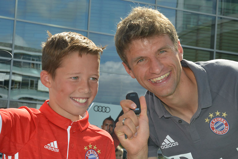 (ty) Stars zum Anfassen. Vor tausenden Fans übernahmen die Spieler des FC Bayern München heute Nachmittag auf der Ingolstädter Audi Piazza ihre neunen „Dienstfahrzeuge“. Und gaben selbstredend jede Menge Autogramm an die meist kleinen Fans, machten Selfies und ließen sich natürlich auch in einem Crash-Kurs ihre neuen Autos erklären. 14 Jahre besteht die Partnerschaft zwischen Audi und dem FC Bayern nun schon, wie Karlheinz Rummenigge kundtat. Und sie sei nicht nur finanziell überaus wichtig für den Verein.