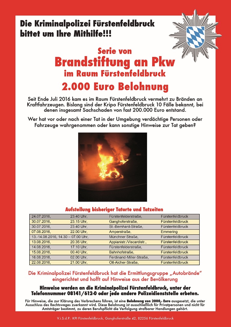 (ty) Wie berichtet, ereigneten sich in Fürstenfeldbruck seit Ende Juli zehn Fahrzeugbrände mit einem Sachschaden von rund 200 000 Euro. Die bei der Kripo eingerichtete Ermittlungsgruppe „Autobrände“ geht davon aus, dass eine vorsätzliche Brandlegung unter Verwendung eines Brandbeschleunigers oder eines Zündmittels vorliegt. Die Tatorte erstrecken sich über das Stadtgebiet. Die Taten wurden überwiegend an Wochenenden und in den Nachtstunden verübt.