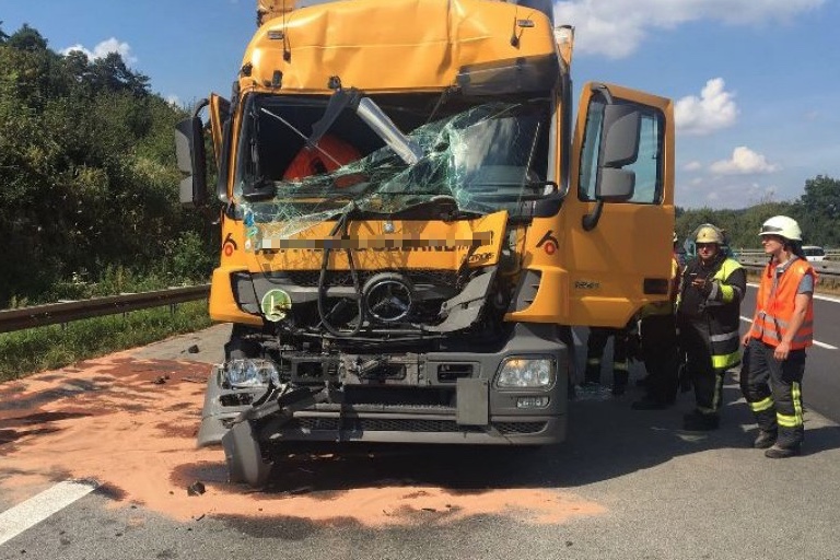 (ty) Heute gegen 13 Uhr war ein 29-jähriger Ukrainer auf der Autobahn A9 mit seinem Sattelzug auf der rechten Spur in Richtung München unterwegs, als es schepperte. Etwa vier Kilometer nach der Anschlussstelle Langenbruck staute sich auf Grund der Baustelle der Verkehr auf der rechten Spur. Der 29-Jährige erkannte dies und bremste seinen Laster ab. Als er noch etwa mit 40 km/h unterwegs war, krachte ihm ein 58-jähriger Österreicher mit seinem Sattelzug hinten drauf.