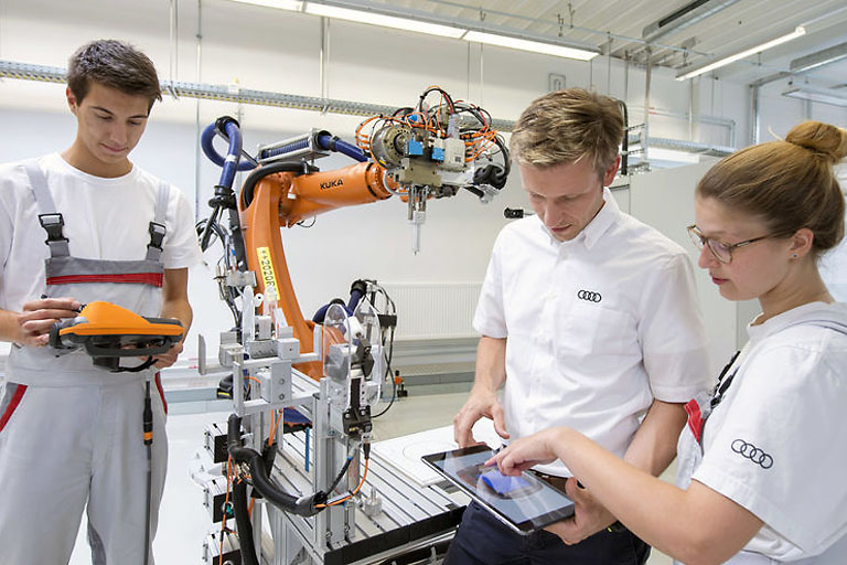 Audi bildet aktuell in 20 verschiedenen Berufen aus und verstärkt sich für seine Zukunftsthemen insbesondere im gewerblich-technischen Bereich: Die Zahl der Mechatroniker-Azubis etwa steigt im Vergleich zum Vorjahr um rund 20 Prozent auf 162. Dabei richtet Audi seine Ausbildung auch inhaltlich konsequent in Richtung Zukunft aus. In allen Berufen gehört mobiles und digitales Lernen mit Tablet-Computern zum Alltag. Zugleich passt der Autohersteller seine Ausbildungsberufe kontinuierlich den neuesten Entwicklungen an: Das Berufsprofil Fachinformatiker für Systemintegration etwa beinhaltet eine Zusatzqualifikation zur Elektrofachkraft. Audi hat damit einen neuen, fachübergreifenden Ausbildungsgang geschaffen.