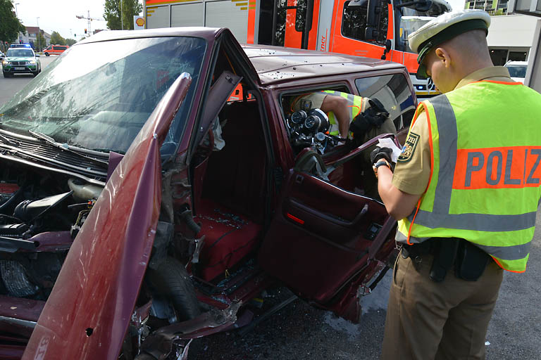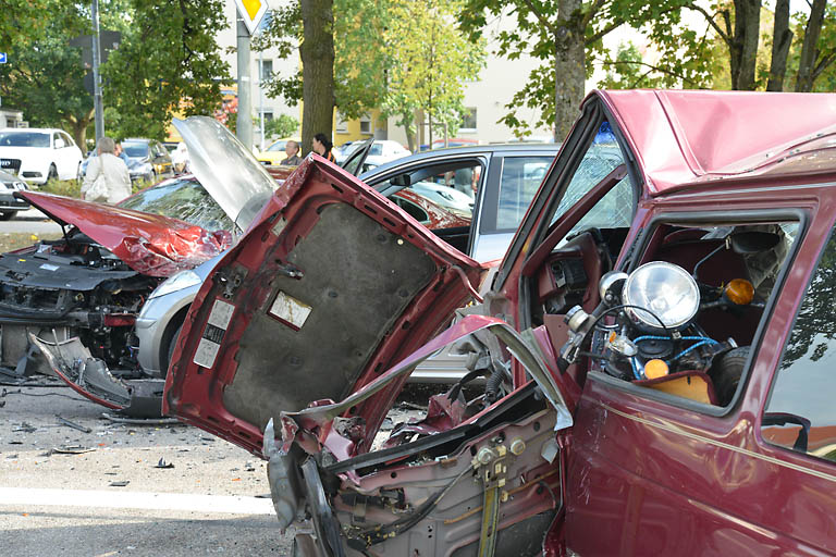 Dodge-Fahrer kommt auf der Ingolstädter Goethestraße auf die Gegenfahrbahn und prallt frontal in entgegenkommenden Passat – Er hatte ein Motorrad geladen, dass ihm in den Rücken flog