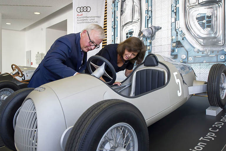 (ty) Hubert Waltl, Vorstand für Produktion und Logistik bei Audi, führte heute die bayerische Wirtschaftsministerin Ilse Aigner (CSU) durch den hochmodernen Audi-Werkzeugbau am Standort Ingolstadt. Dort zeigte er ihr, wie der Autobauer mit einem Metall-3D-Drucker Komponenten für Presswerkzeuge herstellt.