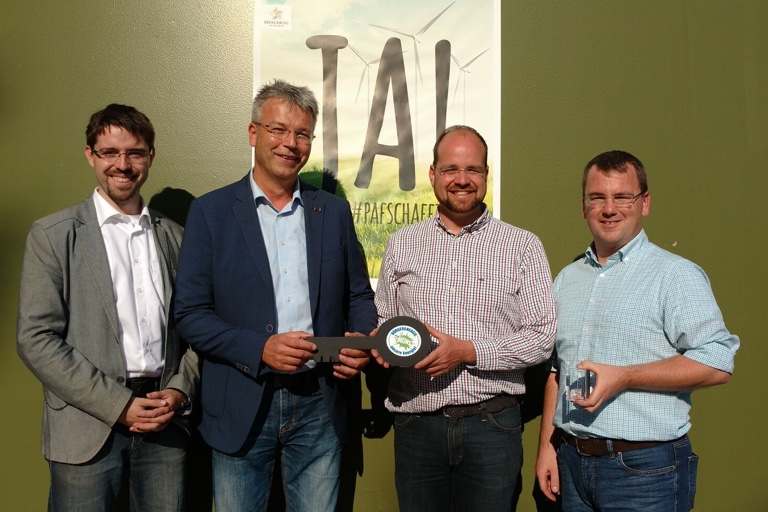 Erik Steinmüller (von links) und Dr. Heiko Rüppel vom Windrad-Hersteller Enercon übergaben den Schlüssel für die Anlage im Lustholz an Andreas Herschmann und Fabian Stahl von der BEG.