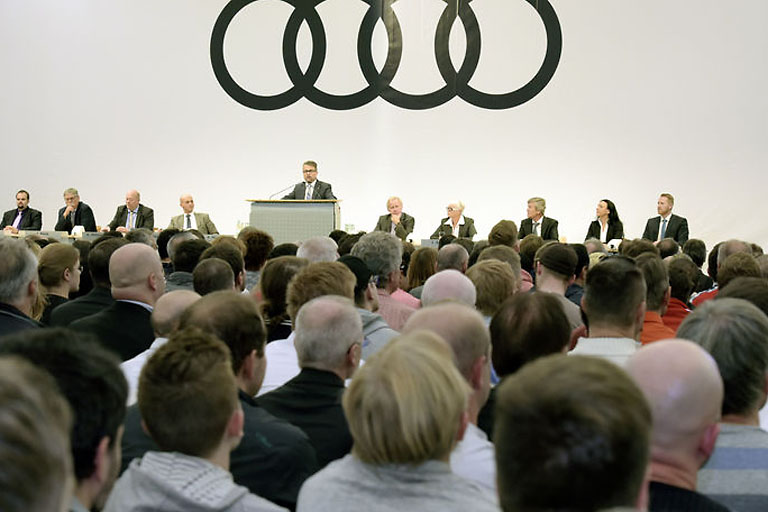 Insgesamt vier Mal im Jahr finden bei Audi Betriebsversammlungen statt und sind fester Bestandteil der jährlichen Terminplanung. Die Versammlungen dienen der umfassenden Information der Beschäftigten über die Tätigkeit des Betriebsrats und geben den Beschäftigten Aufschluss über die Situation des Unternehmens.