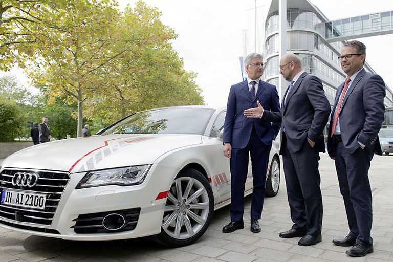 (ty) Der Präsident des Europäischen Parlaments zu Gast bei Audi in Ingolstadt. Martin Schulz hat gestern eine pilotierte Testfahrt im Forschungsauto „Audi A7 piloted driving concept“ auf der Autobahn A9 unternommen. Rupert Stadler, Vorstandschef von Audi, und Peter Mosch, Gesamtbetriebsratsvorsitzender, begrüßten ihn bei seiner Ankunft am Audi-Forum Ingolstadt.