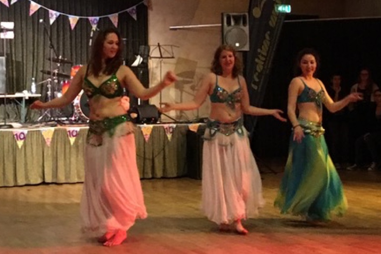 Einmal „Quer über den Globus“ ging es für die Zuschauer anschließend mit dem gleichnamigen Medley von Linda Rosenberger, eine der Lehrkräfte der Geisenfelder Tanzschule für Bauchtanz, Belly-Hip-Hop und Salsa. Unterstützt wurde sie von den „Tanzenden Perlen“, einer Bauchtanzgruppe aus Pfaffenhofen.